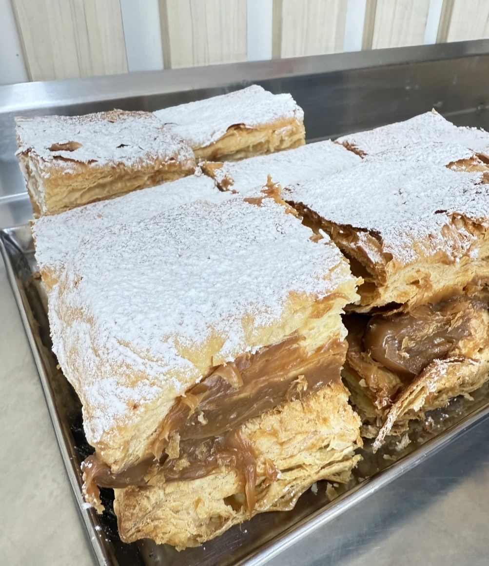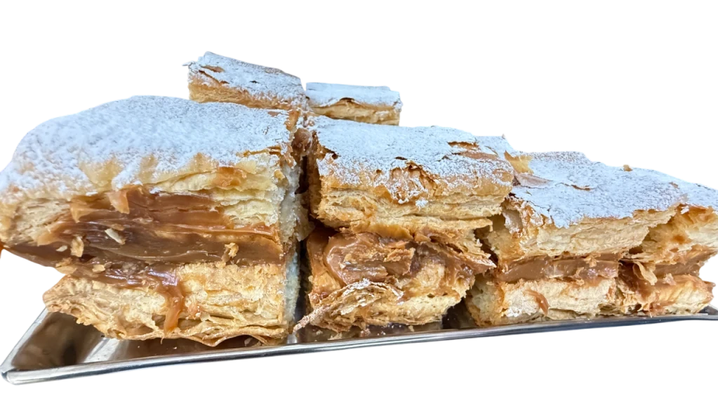 Nuestro mil hojas es un postre elegante y clásico, elaborado con finas capas de masa hojaldrada horneadas a la perfección. Entre cada capa se esconde un suave relleno de manjar blanco, que aporta dulzura y cremosidad en cada bocado. La superficie se decora con azúcar impalpable, realzando su presentación y sabor.