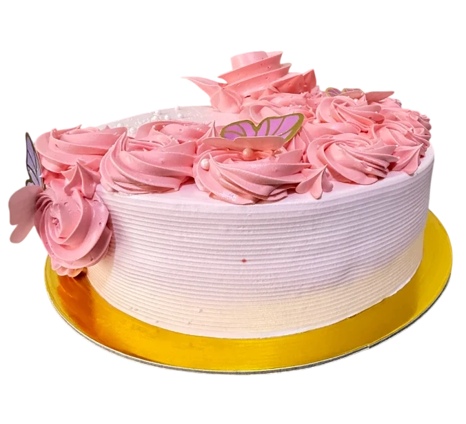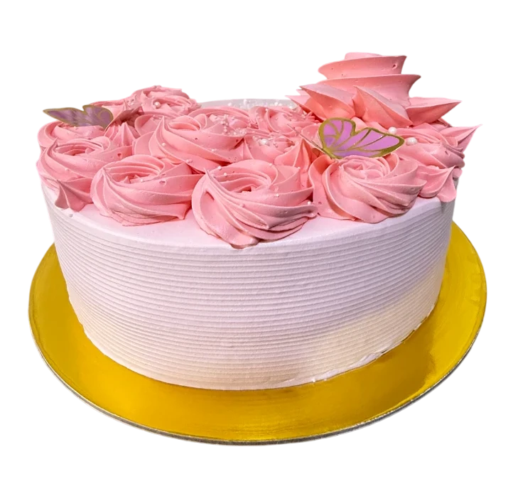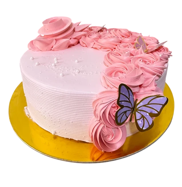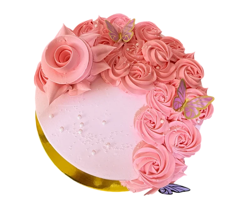 Una delicioso pastel elaborado con queque de vainilla suave y esponjoso, con pasas y chispas de chocolate que aportan una textura y dulzura irresistibles. Relleno con manjar blanco y decorado elegantemente con rosas en forma de cascada y mariposas que la convierte en el centro perfecto de cualquier celebración.
