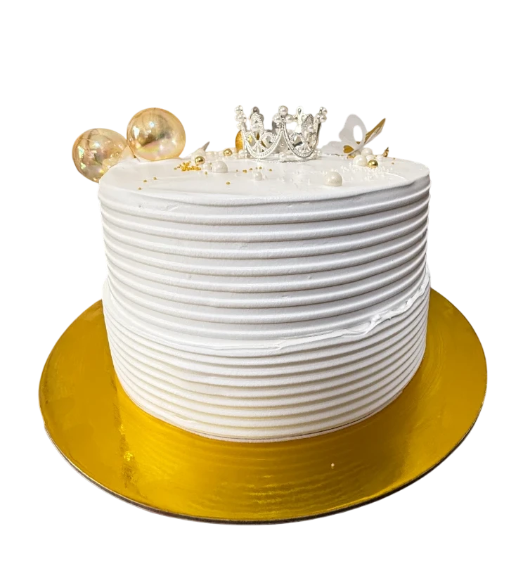 Una delicioso pastel elaborado con queque de vainilla suave y esponjoso, con pasas y chispas de chocolate que aportan una textura y dulzura irresistibles. Relleno con manjar blanco y decorado elegantemente con detalles dorados, perlas, mariposas y una corona que la convierte en el centro perfecto de cualquier celebración.