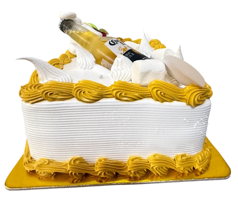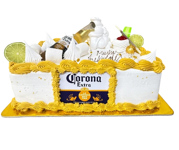Una delicioso pastel elaborado con queque de vainilla suave y esponjoso, con pasas y chispas de chocolate que aportan una textura y dulzura irresistibles. Relleno con manjar blanco y decorado elegantemente con el logo de la cerveza corona, espuma, marshmelows y una cerveza coronita en la cima que la convierte en el centro perfecto de cualquier celebración.