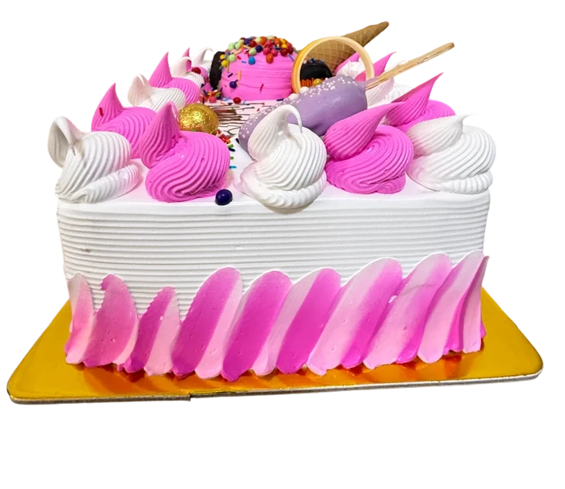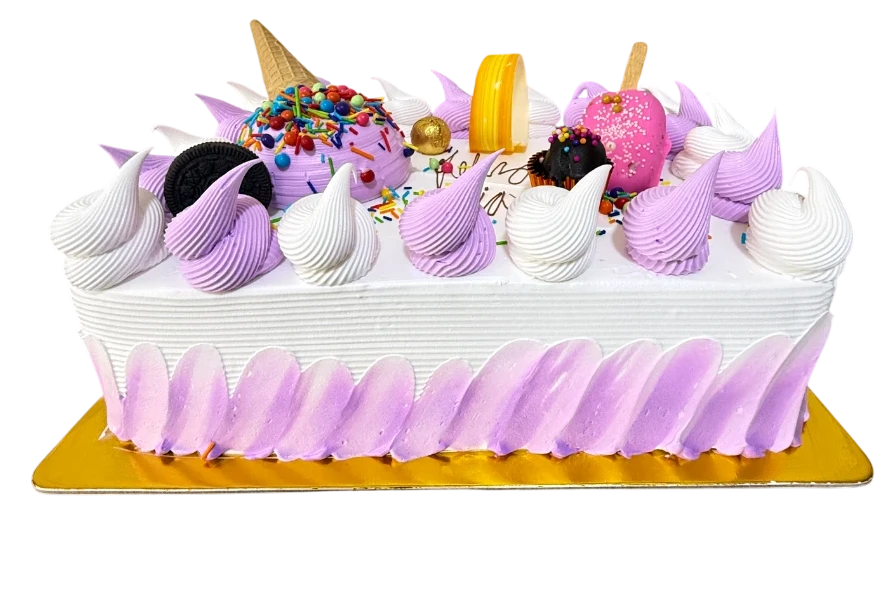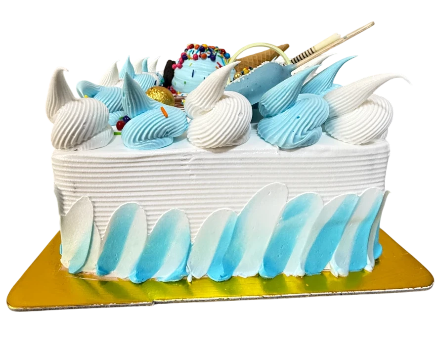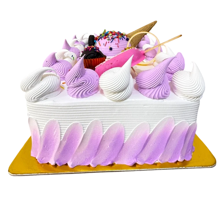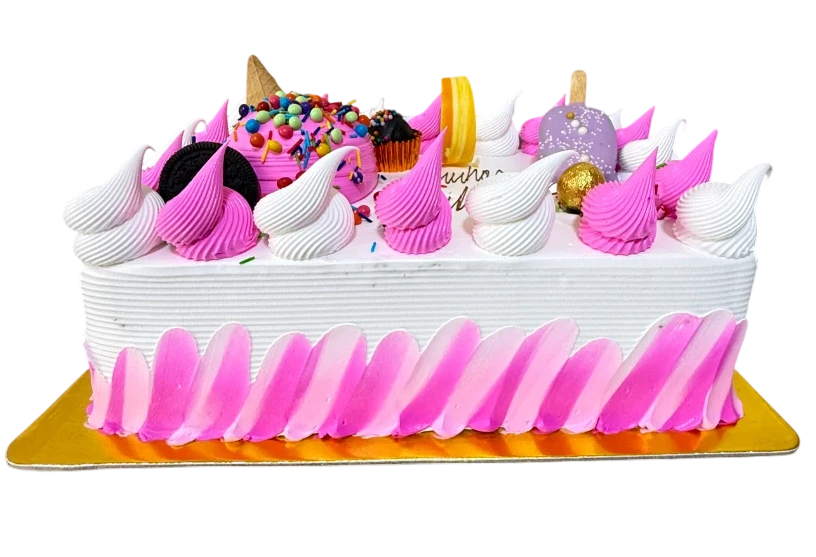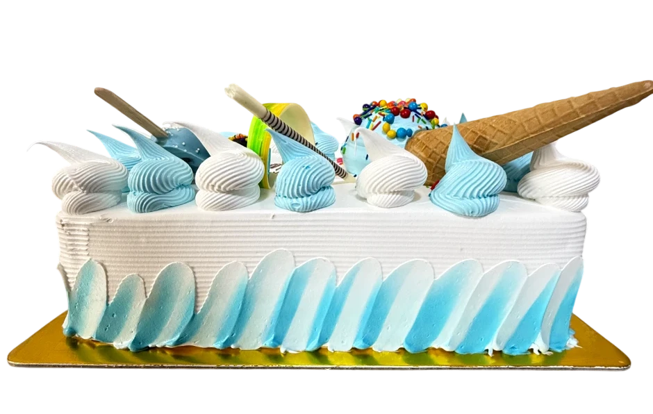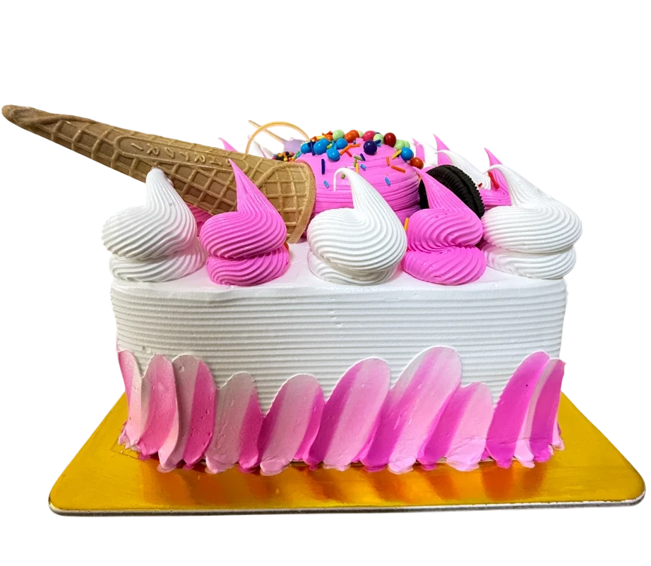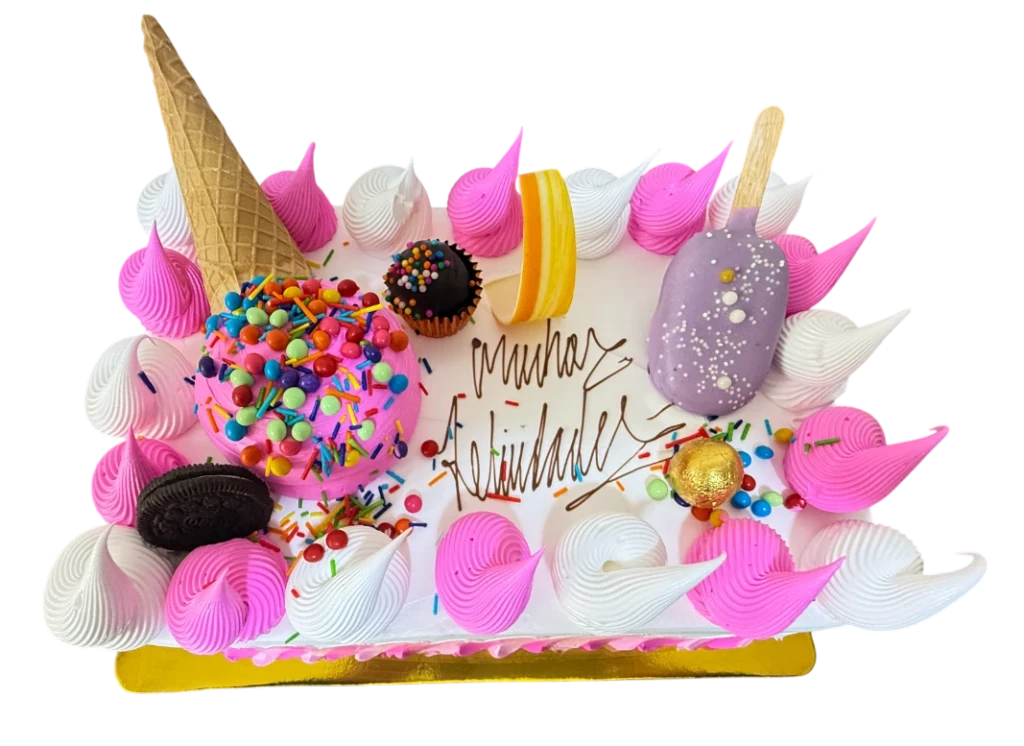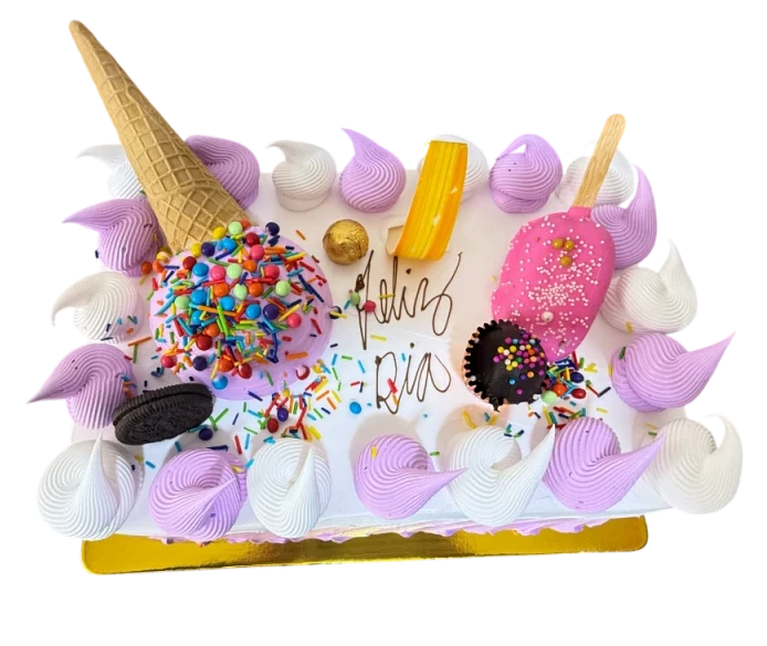 Una delicioso pastel elaborado con queque de vainilla suave y esponjoso, con pasas y chispas de chocolate que aportan una textura y dulzura irresistibles. Relleno con manjar blanco y decorado elegantemente con una paleta, una trufa y un cono de helado que la convierte en el centro perfecto de cualquier celebración.